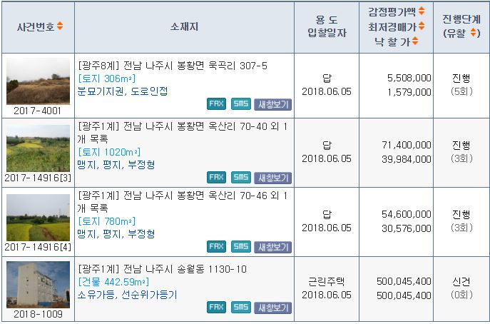 À̹ø ÁÖ Àü¶ó³²µµ ³ªÁֽÿ¡¼´Â ÃÑ 4°ÇÀÇ °æ¸Å¹°°ÇÀÌ ÁøÇàµÈ´Ù. ¹°°Ç ¿ëµµº°·Î´Â ±Ù¸°ÁÖÅà 1°Ç, ÅäÁö 3°ÇÀÌ´Ù.