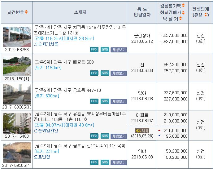 À̹ø ÁÖ ±¤ÁÖ±¤¿ª½Ã ¼±¸¿¡¼´Â ÃÑ 17°ÇÀÇ °æ¸Å¹°°ÇÀÌ ÁøÇàµÈ´Ù. ¹°°Ç ¿ëµµº°·Î´Â ¾ÆÆÄÆ® 5°Ç, ´Ù¼¼´ëÁÖÅà 1°Ç, ±Ù¸°»ó°¡ 5°Ç, ÅäÁö 6°ÇÀÌ´Ù.
